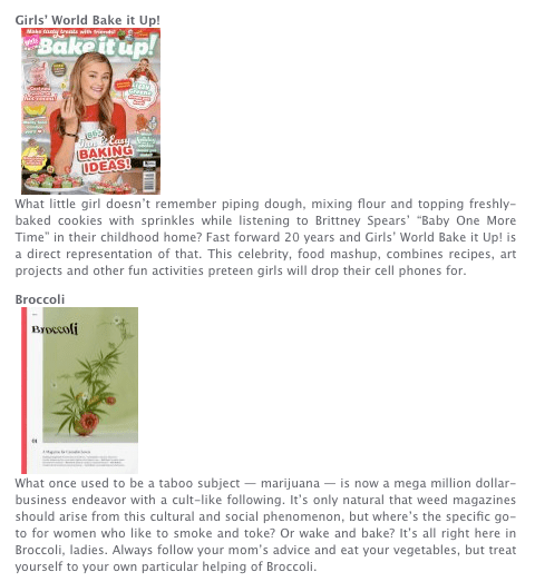 In 2018, there’s a magazine called Broccoli that’s about marijuana while Bake It Up! is a magazine about cooking. [Mr. Magazine]